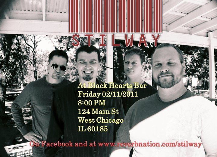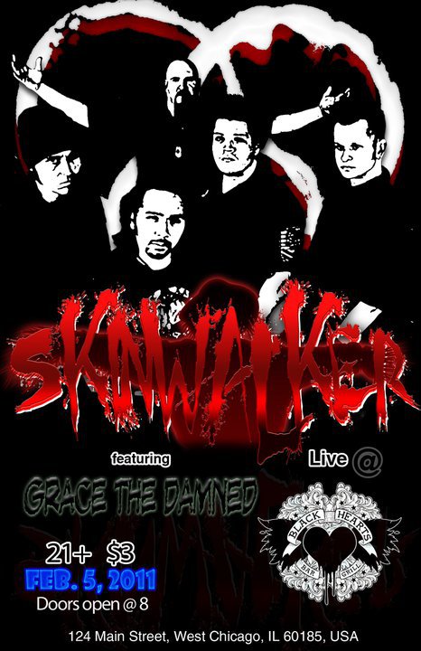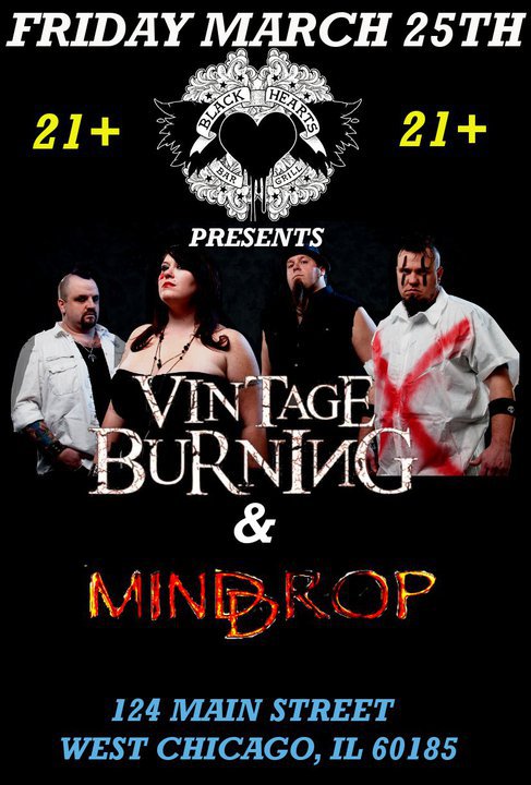 Black Hearts | Links | Parking & Transportation | @BlackHearts PAST EVENTS & SHOWS: 2010-2011 Friday, March 25 * Vintage Burning, MIND DROP, $3 Thursday, March 24 * Hate Made Easy, $5 Tuesday, March 22 * The Dead Room, $3 Saturday, March 19 * Surrender Dorothy, Beyond Words, $5 Thursday, March 17 * Signum A.D., Nick Coury, $5 Friday, March 18 * Punch Cabbie, THE WOP (The Wild Onion People), $5 Tuesday, March 15 * Face Time Police, $3 Saturday, March 12 * DIES MALI, Abstraction Friday, March 11 * PATCHWORK, Echoes of Ruin Thursday, March 10 * DEFCON, Cyanotic, $5 Wednesday, March 9 * Of Earth and Ashes Saturday, March 5 * Illusions Fate, SPYDERBONE, $5 Friday, March 4 * BLACK OUT AT BLACK HEARTS with The Black Saints and HAIL THE BLACK DRAGONS (on the main stage), BRYAN W (in front lounge), $5 Tuesday, March 1 * Black Hearts' Black Market Tuesdays with Cynergy 67, $3 Friday, March 4 * BLACK OUT AT BLACK HEARTS with The Black Saints and HAIL THE BLACK DRAGONS (on the main stage), BRYAN W (in front lounge), $5 Saturday, March 5 * Illusions Fate, SPYDERBONE, $5 Wednesday, March 9 * Of Earth and Ashes Thursday, February 24 * Bat Masterson, $3 Friday, February 25 * Comasoft, Counterfeit i; $5 Tuesday, February 15 * BLACK MARKET TUESDAYS with Suture Self, Xiting The Systm Saturday, February 19 * Mass Chemistry, Space Giant Saturday, February 12 * Cereboca, Louder Than Alice Friday, February 11 * The Prime, STILWAY Thursday, February 10 * Brandon McHose Saturday, February 5 * Skinwalker, Grace The Damned Friday, January 28 * Vultress, KAPRE Wednesday, January 26 * Silhouette Radio Friday, January 21 * The Fire At Endsville, MENTHISARMY< Friday, January 14 * Short To Ground, Cobalt Core Friday, January 7 * Spyderbone, 21+ Tuesday, January 4 * ("Ignited" Tuesdays) * SIRENS IN VEIN with DJ's Sean Payne and Alien Crush spinning after! <RSVP on Facebook> Friday, December 31 * No cover! Drink specials! Champagne toast at midnight!(You don't even have to drive as the Metra station is a block away! -the Metra schedule) Wednesday, December 29 (Wednesday Night Special) * 30 DOLLARS in the front lounge. FREE SHOW! <RSVP on Facebook> Saturday, December 18 * "Low Dough Rock N Roll Christmas Show" with THE LAST VEGAS! (Special Guests: Hessler) ONLY $5 at the door. 21+ Friday, December 17 * MUNGER and The Laffing Hyenas, $6 , 21+ Saturday, December 11 * The Dead Superheros Orchestra, 21+ Friday, December 10 * Centaurus and Power of Time Saturday, November 27 * Empire Friday, November 26 * Eliminator (ZZ Top) Wednesday, November 24 * Triangle Green Saturday, November 20 * 90's Nation Friday, November 19 * Fire at Endsville Saturday, November 13 * Sik Fiction and MUNGER Friday, November 12 * Radio Refugees Thursday, November 11 * GRAND OPENING Past Events & Shows Posters: below